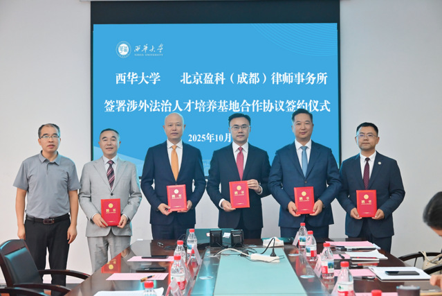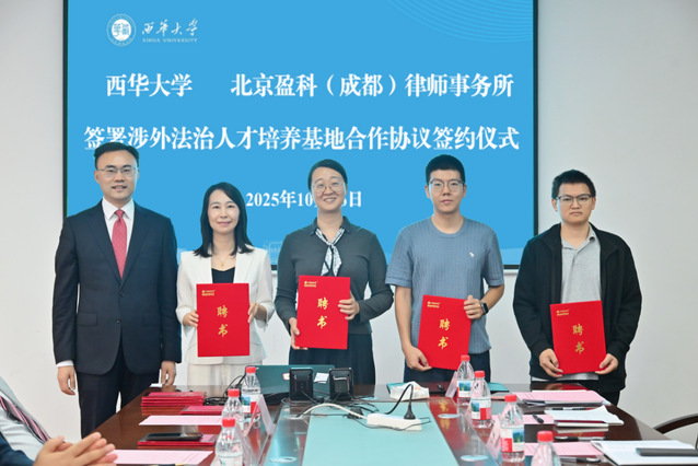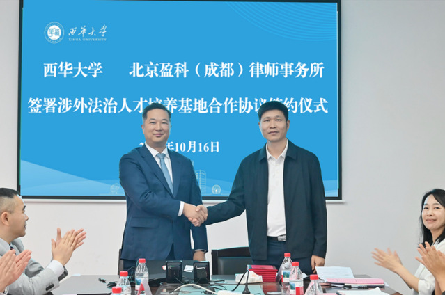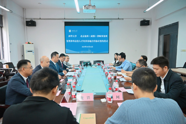 2025年10月16日,西华大学法学与社会学学院与北京盈科(成都)律师事务所共建涉外法治人才培养基地签约仪式在我校成功举行。此次合作是我院服务国家涉外法治战略、创新法治人才培养机制的重要举措,标志着学院在深化产教融合、拓展实务资源方面取得新突破。学院院长张邦铺、党委书记张雪征,盈科成都管委会名誉主任廖行、管委会主任寇翼等双方代表出席仪式。签约仪式由学院副院长熊征主持。