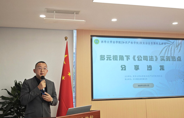 2025年12月11日,西华大学法学院(知识产权学院)首期校友活动——“多元视角下《公司法》实务热点沙龙”在四川精伦律师事务所会议室举行。西华大学法学院(知识产权学院)张邦铺院长、杨廷文副教授、林洋博士,校友分会会长刘倬、副会长黄茂生、刘海光、苟建军、校友分会秘书处相关人员,四川精伦律师事务所党支部书记、副主任余帆律师,合伙人罗君律师、吴娟律师以及胡川山律师等40余人出席本次活动。