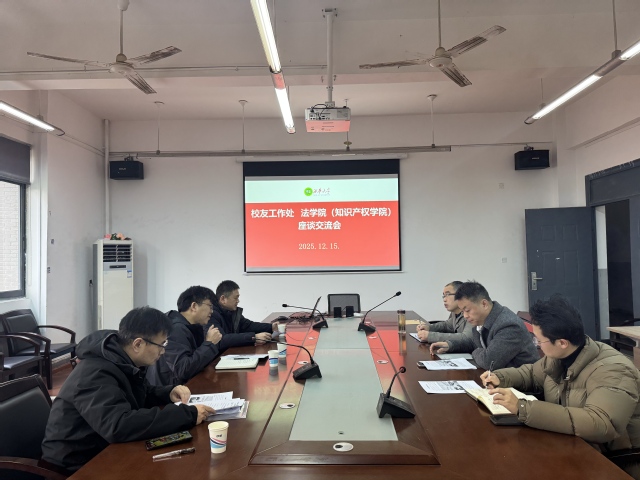 2025年12月15日,校友工作处罗世韡处长一行3人来到法学院(知识产权学院),与学院党委书记肖东华、院长张邦铺及教师代表围绕如何进一步发挥法学专业校友特色,助力校友工作开展进行了座谈交流。