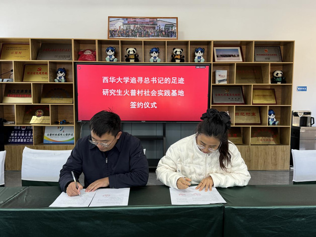 严菲书记对合作的开启表示祝贺,并简要介绍了火普村目前的基本情况及未来规划,表明本次合作对火普村的重要性和及时性,并期待未来能与西华大学携手,法治进乡村方面展开多层次、多形式的交流与合作。双方代表共同签署了《西华大学追寻总书记的足迹研究生火普村社会实践基地合作协议》。
