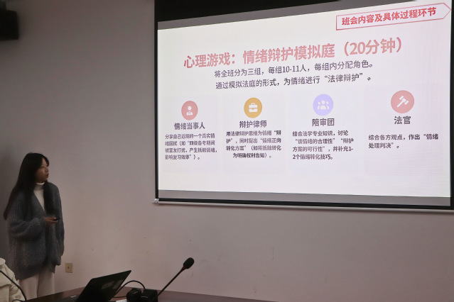 决赛现场,各位心理委员紧扣主题,充分结合心理知识和班级实际情况,进行了精彩的策划案陈述。选手们借助精心准备的PPT,从班会主题、目标、形式到具体环节和预期效果,系统地展示了各自富有创意且切实可行的班会方案。在短短五分钟的展示时间内,他们或引经据典,将法律常识与心理调适相结合;或设计互动环节,巧妙化解人际交往困境,充分展现了各班心理委员严谨的态度和卓越的风采。
